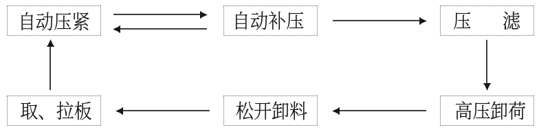 (4) 液压部件:它是糖心VLOG在线观看的动力装置,在 PLC及电气控制下,通过油泵、油缸、液压元件完成各种动作,可实现自动压紧、自动补压、压滤、拉板、高压卸荷、自动松开等功能。